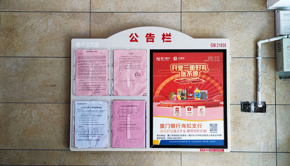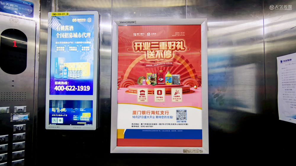 此次廈門(mén)銀行海虹支行選擇與天藝傳媒進(jìn)行戶(hù)外媒體投放的合作,投放海滄區(qū)(以海滄的生活區(qū)、海虹支行周邊區(qū)域?yàn)橹?的多個(gè)戶(hù)外廣告媒體,包括公交候車(chē)亭媒體、電梯框架廣告、社區(qū)公告欄媒體及社區(qū)出入口的道閘媒體等。