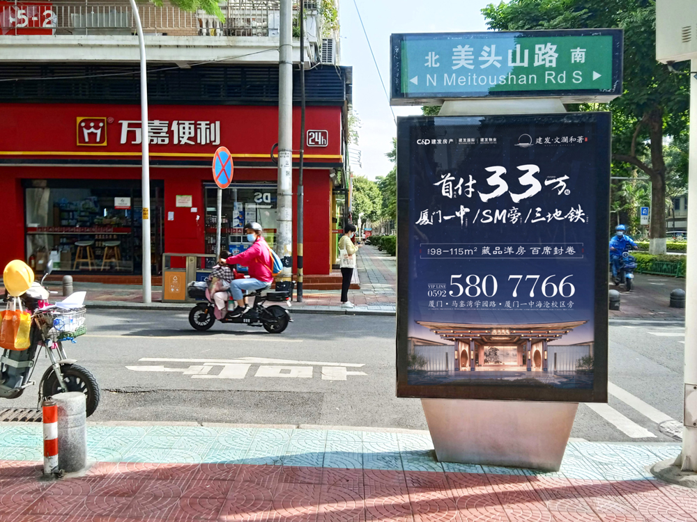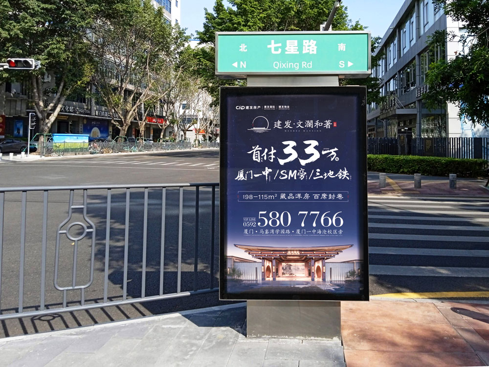 本次建發(fā)文瀾和著二期樓盤(pán)再次與天藝傳媒攜手,共同續(xù)寫(xiě)輝煌。建發(fā)文瀾和著二期開(kāi)盤(pán),再次選擇投放戶外城市路名牌超過(guò)100座,且均在島內(nèi)黃金點(diǎn)位覆蓋,包括主干道,如:廈禾路、體育路、金尚路、湖濱中路、禾祥西路、禾祥東路等車(chē)流人流密集路段,以及商超圈周邊路段,如:火車(chē)站羅賓森、思北路口、輪渡周邊。